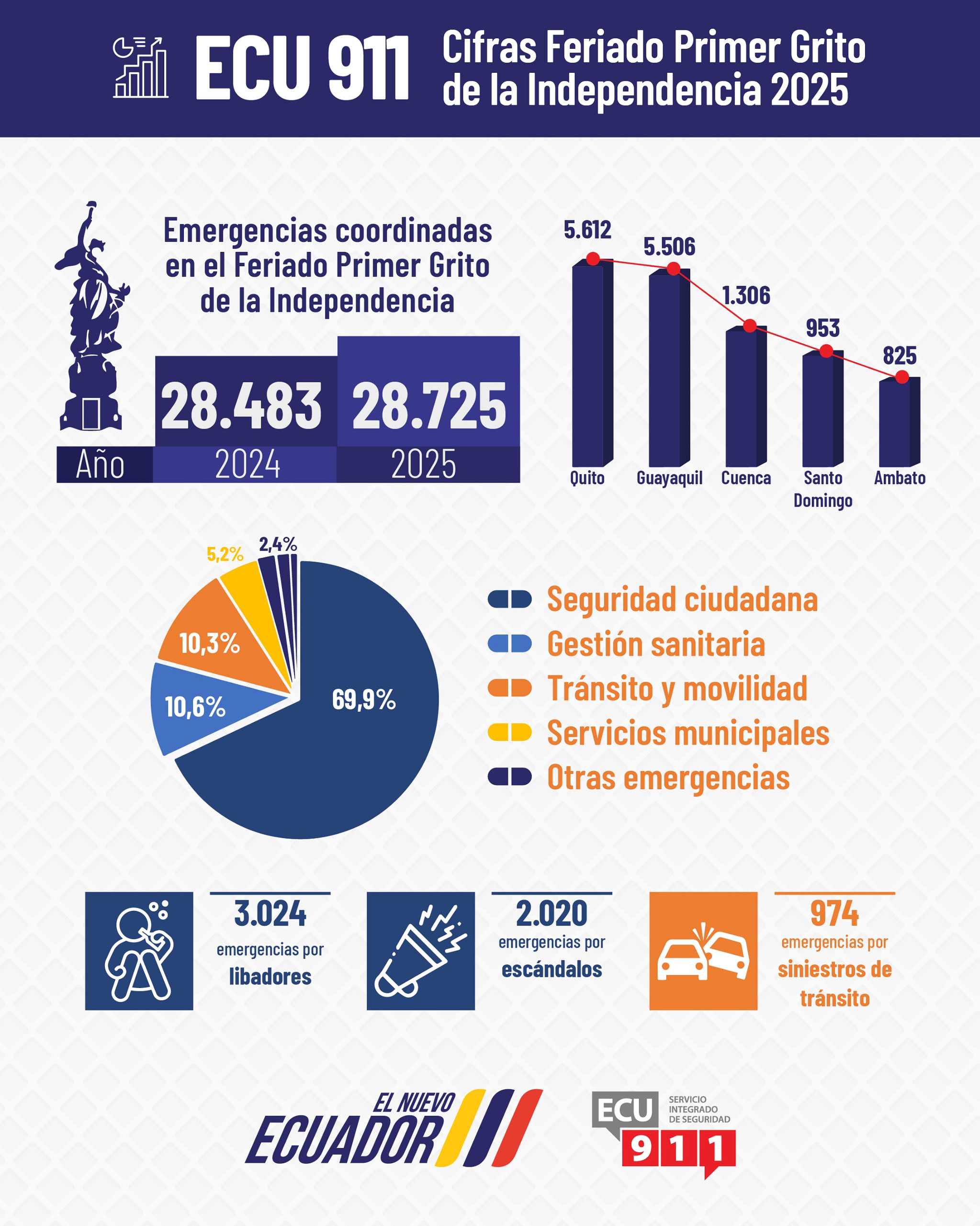 El Servicio Integrado de Seguridad ECU-911, en coordinación con las entidades de primera línea de respuesta, atendió 28.725 emergencias del 8 al 11 de agosto, durante el feriado por el Primer Grito de la Independencia. Siendo el Distrito Metropolitano de Quito el que concentró el mayor número de novedades.